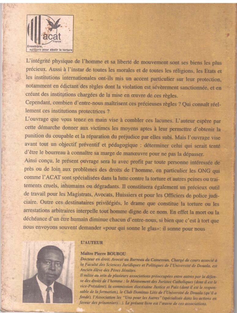 5) Vos Droits Face à la Torture et aux Arrestations Arbitraires. Editions Avenir Douala, Juin 1997, avec le concours de la FEDERATION INTERNATIONALE DE L’ ACTION DES CHRETIENS POUR L’ ABOLITION DE LA TORTURE (FI-ACAT).